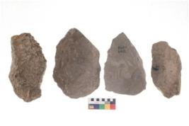 | Description / विवरण | These are n 4 of worked tools. They are tapering at one end and have sharp edges. They have round base and show dominant irregular scar pattern. |