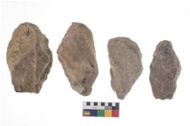 | Description / विवरण | These are n 4 of worked tools. They are tapering at one end and have sharp edges. They have round base and show dominant irregular scar pattern. |
