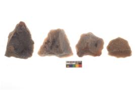| Description / विवरण | There are n 4 utilized worked flakes; they show multidirectional irregular scar pattern on both dorsal and ventral face of the flakes. Two are tapering at one end and having sharp edges. |