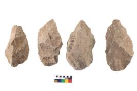 | Description / विवरण | These are n 4 of worked tools. They are tapering at one end and have sharp edges. They have round base and show dominant irregular scar pattern. |