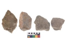 | Description / विवरण | These are n 4 of worked tools. They are tapering at one end and have sharp edges. some have flat base and show dominant irregular scar pattern. |