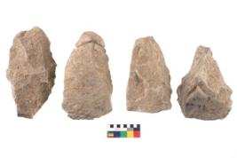 | Description / विवरण | These are n 4 of worked tools. They are tapering at one end and have sharp edges. They have round base and show dominant irregular scar pattern. |
