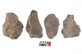 | Description / विवरण | These are n 4 of worked tools. They are tapering at one end and have sharp edges. Some have round base and show dominant irregular scar pattern and have broken tip. |