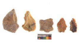 | Description / विवरण | There are n 5 utilized worked flakes; they show multidirectional irregular scar pattern on both dorsal and ventral face of the flakes.Four of them tapering at one end and having sharp edges. |