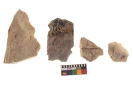 | Description / विवरण | There are n 4 utilized worked flakes; they show multidirectional irregular scar pattern on both dorsal and ventral face of the flakes.One is tapering at one end with a point and having sharp edges. |