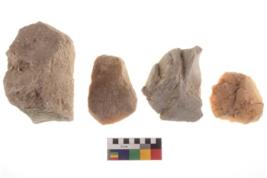 | Description / विवरण | There are n 4 utilized worked flakes; they show multidirectional irregular scar pattern on both dorsal and ventral face of the flakes.One is tapering at one end with a point and having sharp edges. |