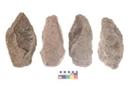| Description / विवरण | These are n 4 of worked tools. They are tapering at one end and have sharp edges. They have round base and show dominant irregular scar pattern. |