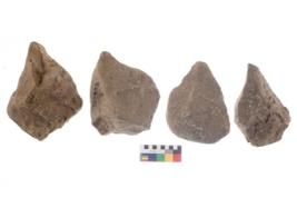 | Description / विवरण | These are n 4 of worked tools. They are tapering at one end and have sharp edges. They have round base and show dominant irregular scar pattern. |