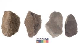 | Description / विवरण | These are n 4 of worked tools. They are tapering at one end and have sharp edges. They have round base and show dominant irregular scar pattern. |