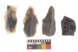| Description / विवरण | There are n 4 utilized worked flakes; they show multidirectional irregular scar pattern on both dorsal and ventral face of the flakes.Three are tapering at one end and having sharp edges. |