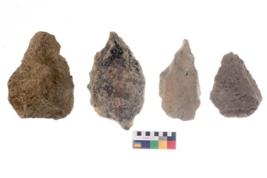 | Description / विवरण | These are n 4 of worked tools. They are tapering at one end and have sharp edges. They have round base and show dominant irregular scar pattern. |