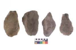 | Description / विवरण | These are n 4 of worked tools. They are tapering at one end and have sharp edges. They have round base and show dominant irregular scar pattern. |