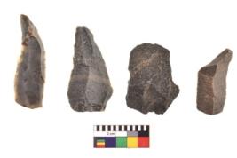 | Description / विवरण | There are n 4 utilized flake cores. There are multidirectional irregular scar pattern on both dorsal and ventral face of the flake cores. Two are tapering at one end and two have sharp edges. |