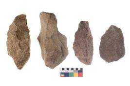 | Description / विवरण | These are n 4 of worked tools. They are tapering at one end and have sharp edges. They have round base and show dominant irregular scar pattern. |