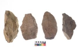 | Description / विवरण | These are n 4 of handaxe tools. They are tapering at one end and have sharp edges. They have round base and show dominant irregular scar pattern. |