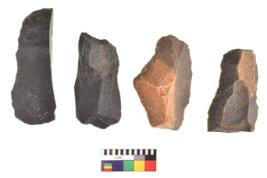 | Description / विवरण | There are n 4 utilized flake cores. There are multidirectional irregular scar pattern on both dorsal and ventral face of the flake cores. Two are tapering at one end and two have sharp edges. |