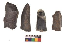 | Description / विवरण | There are n 4 utilized flake cores. There are multidirectional irregular scar pattern on both dorsal and ventral face of the flake cores. Two are tapering at one end and two have sharp edges. |