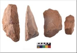 | Description / विवरण | There are n 4 of utilized worked cores. There are multidirectional irregular dominant scar pattern on both dorsal and ventral face of the flakes. Some are tapering at one end. |