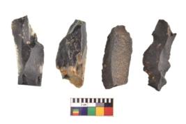 | Description / विवरण | There are n 4 utilized flake cores. There are multidirectional irregular scar pattern on both dorsal and ventral face of the flake cores. Three are tapering at one end and one has sharp edges. |