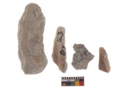 | Description / विवरण | There are n 4 utilized worked flakes; they show multidirectional irregular scar pattern on both dorsal and ventral face of the flakes.Three are tapering at one end and all are having sharp edges. All vary in shape and size. |