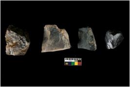 | Description / विवरण | There are n 4 of utilized worked cores. They show multidirectional irregular dominant scar pattern. One of them is tapering at one end. All have blunt edges. |