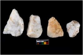 | Description / विवरण | There are n 4 utilized worked flakes; they show multidirectional irregular scar pattern on both dorsal and ventral face of the flakes. Two are tapering at one end and having sharp edges. One of them is having impurities. |