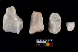 | Description / विवरण | There are n 4 utilized worked flakes; they show multidirectional irregular scar pattern on both dorsal and ventral face of the flakes. One is tapering at one end and having sharp edges. |