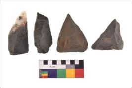 | Description / विवरण | There are n 4 utilized flake cores. There are multidirectional irregular scar pattern on both dorsal and ventral face of the flake cores. One is tapering at one end and three have sharp edges. |
