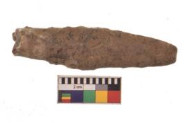 | Description / विवरण | Specimen with headless; flat body, blunted bottom and thickly corroded surface. |