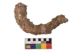 | Description / विवरण | Specimen with curved flat body having uniform thickness with one conical end and thickly corroded surface. |