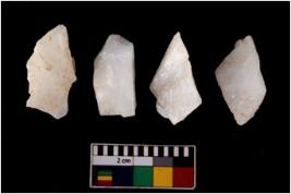 | Description / विवरण | There are n 4 flake cores. All of them are fully fluted flake cores without any trace of crested ridge flakes. Some are tapering at one end and some have sharp edges. |
