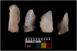 | Description / विवरण | There are n 4 flake cores. All of them are fully fluted flake cores without any trace of crested ridge flakes. Some are tapering at one end and some have sharp edges. |