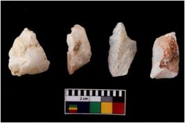 | Description / विवरण | There are n 4 flake cores. All of them are fully fluted flake cores without any trace of crested ridge flakes. Some are tapering at one end and some have sharp edges. |