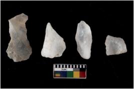 | Description / विवरण | There are n 4 flakes tool; there are flakes tool with prominent flaking marks. It made up of a large flakes with sides trimmed. |