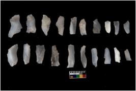 | Description / विवरण | Flake - There are n 20 flakes tool; there are multidirectional irregular scar pattern on them; made of short flakes and all twenty have tapering edges. |