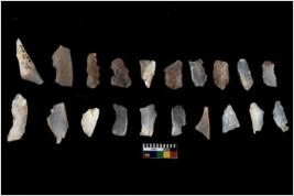 | Description / विवरण | Flake - There are n 20 flakes tool; there are multidirectional irregular scar pattern on them; made of short flakes and all twenty have tapering edges. |