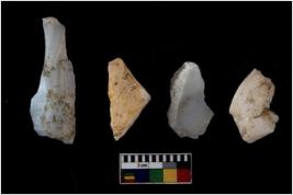 | Description / विवरण | There are n 4 flakes tool; there are flakes tool with prominent flaking marks. It made up of a large flakes with sides trimmed. |
