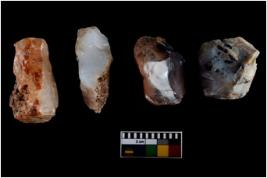 | Description / विवरण | There are n-4 of utilized cores. There are multidirectional irregular dominant scar pattern on both dorsal and ventral face of the cores. Some of them bulge of percussion and some are flat flake cores. |