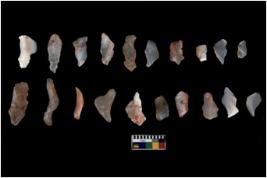 | Description / विवरण | Flake - There are n 20 flakes tool; there are multidirectional irregular scar pattern on them; made of short flakes and all twenty have tapering edges. |