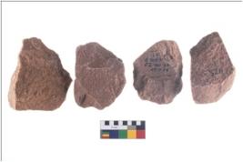 | Description / विवरण | There are n-4 of utilized cores. There are multidirectional irregular dominant scar pattern on both dorsal and ventral face of the cores. Some of them bulge of percussion and some are flat flake cores. |