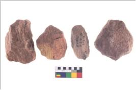| Description / विवरण | There are n-4 of utilized cores. There are multidirectional irregular dominant scar pattern on both dorsal and ventral face of the cores. Some of them bulge of percussion and some are flat flake cores. |