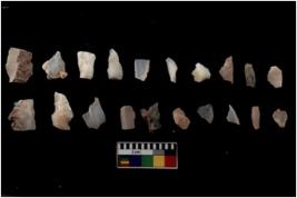 | Description / विवरण | Specimen of flakes tool with prominent flaking marks. It made up of a short flakes with sides trimmed. |