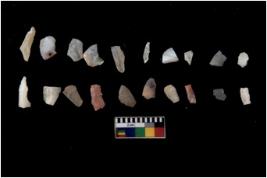 | Description / विवरण | Specimen of flakes tool with prominent flaking marks. It made up of a short flakes with sides trimmed. |