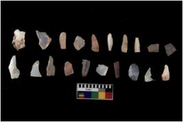 | Description / विवरण | Specimen of flakes tool with prominent flaking marks. It made up of a short flakes with sides trimmed. |