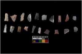| Description / विवरण | Specimen of flakes tool with prominent flaking marks. It made up of a short flakes with sides trimmed. |