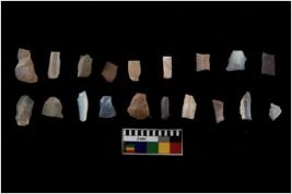 | Description / विवरण | Specimen of flakes tool with prominent flaking marks. It made up of a short flakes with sides trimmed. |