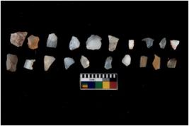 | Description / विवरण | Specimen of flakes tool with prominent flaking marks. It made up of a short flakes with sides trimmed. |