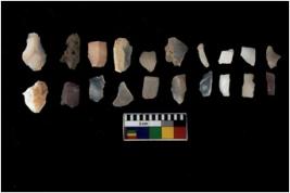 | Description / विवरण | Specimen of flakes tool with prominent flaking marks. It made up of a short flakes with sides trimmed. |
