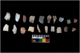| Description / विवरण | Specimen of flakes tool with prominent flaking marks. It made up of a short flakes with sides trimmed. |