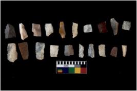 | Description / विवरण | Specimen of flakes tool with prominent flaking marks. It made up of a short flakes with sides trimmed. |